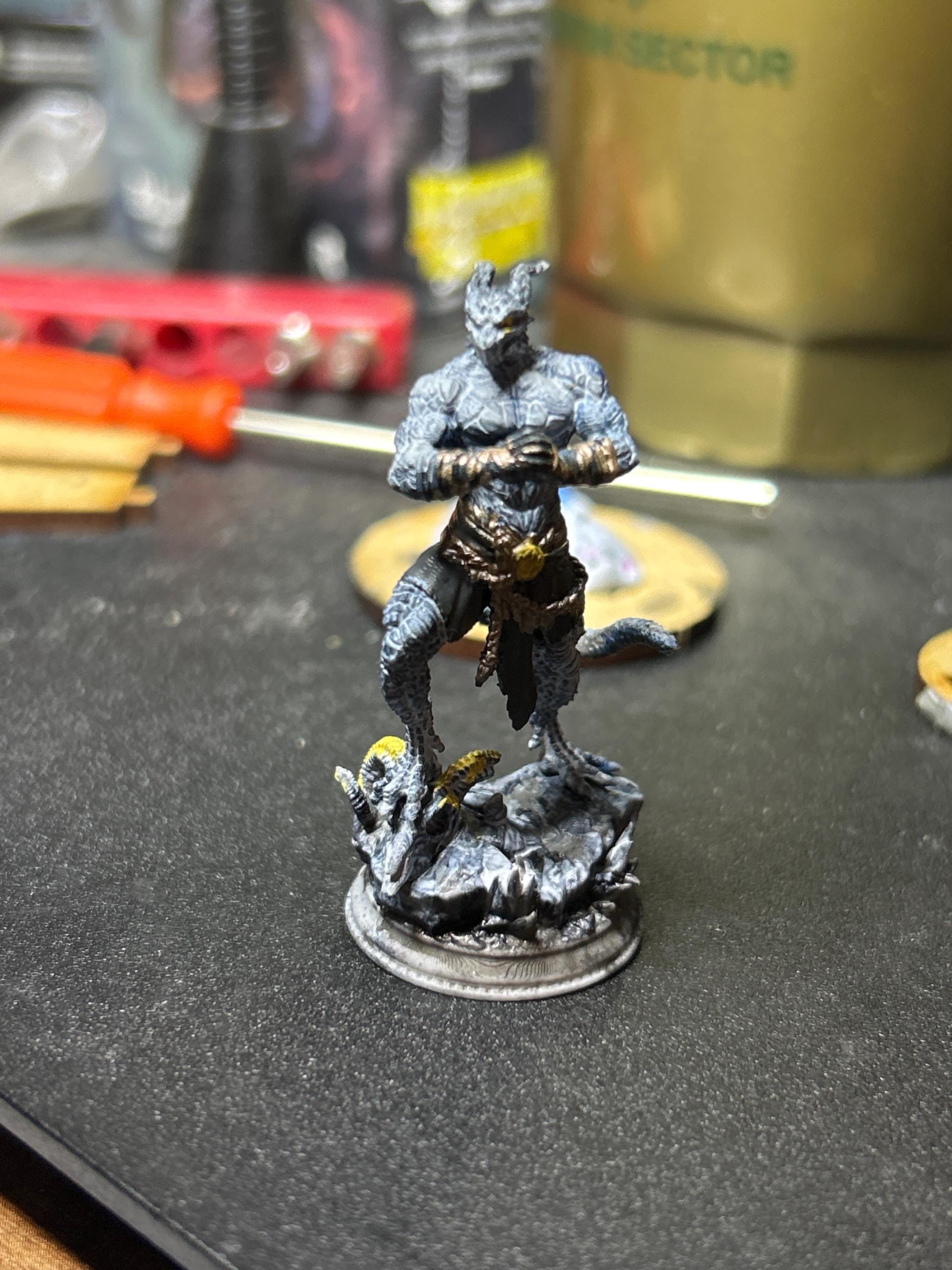 This Dragonborn Monk embodies both physical and spiritual power, depicted with a calm yet imposing stance. His scaled skin, muscular build, and finely crafted attire reflect the monk's unwavering dedication to his martial path. The rocky base, complete with a defeated creature beneath his feet, adds a dynamic narrative to this figure, making it a standout piece in any setting.