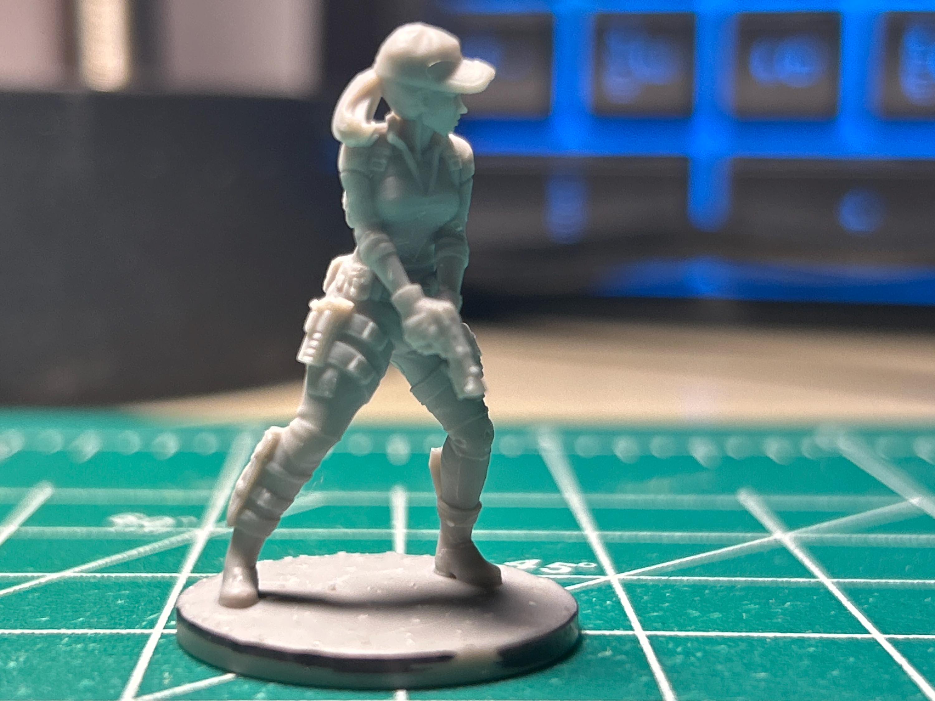 The model features a female survivor clad in form-fitting tactical armor with gear-laden pants and a low-brimmed ball cap. Her twin pistols and ready stance give the sense of a sharp-eyed combatant moments from action. Whether you’re populating a fortified safehouse or narrating a breakneck ambush, she adds grounded realism to your table.