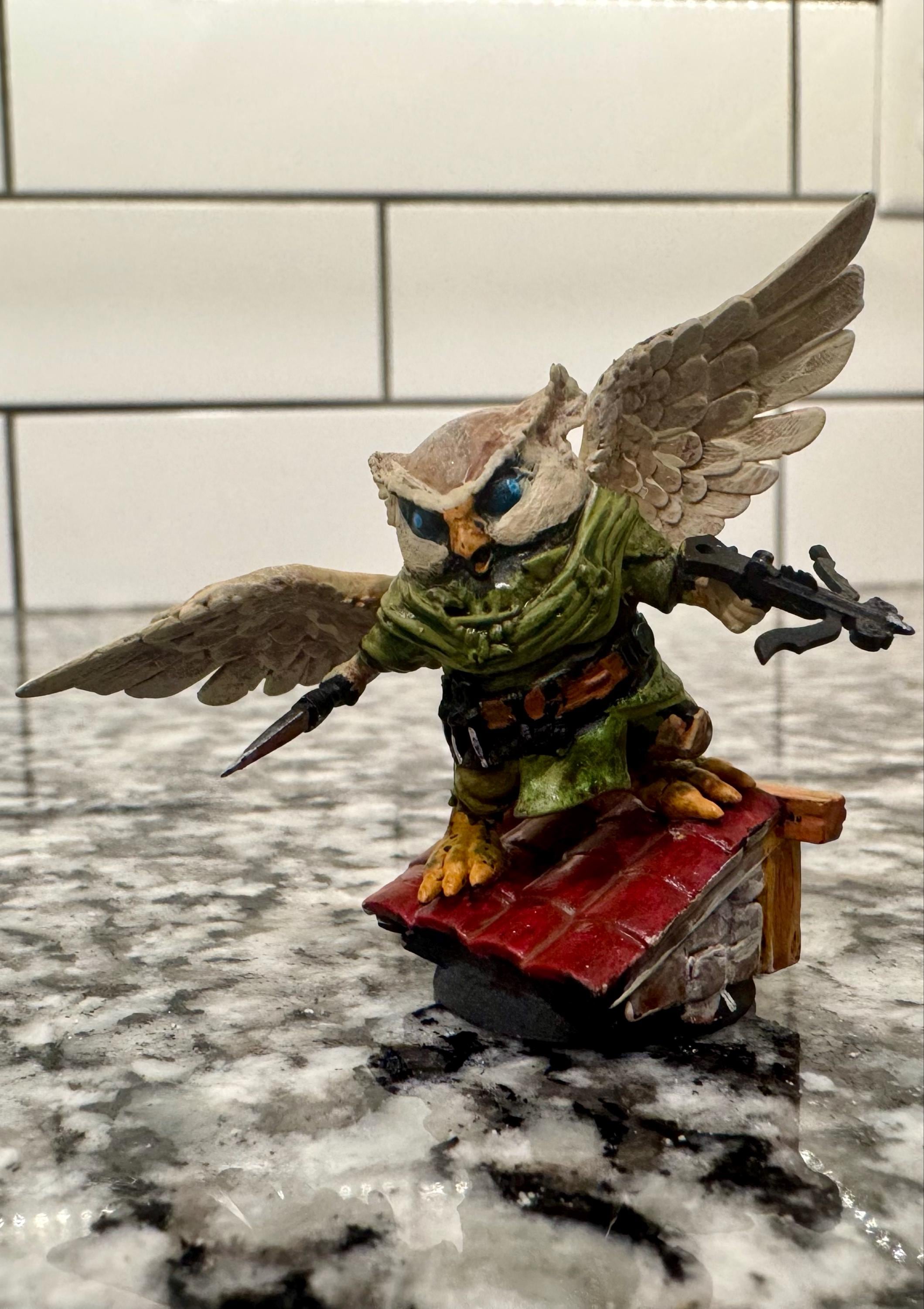 This Owlin Rogue Thief Miniature captures the perfect blend of precision and menace. Wings unfurled in dramatic motion, this feathered assassin crouches atop a detailed rooftop ledge, scouting for the next mark. Whether a skilled burglar navigating city skylines or a masked vigilante enforcing their own code of justice, this model brings striking narrative to any campaign.