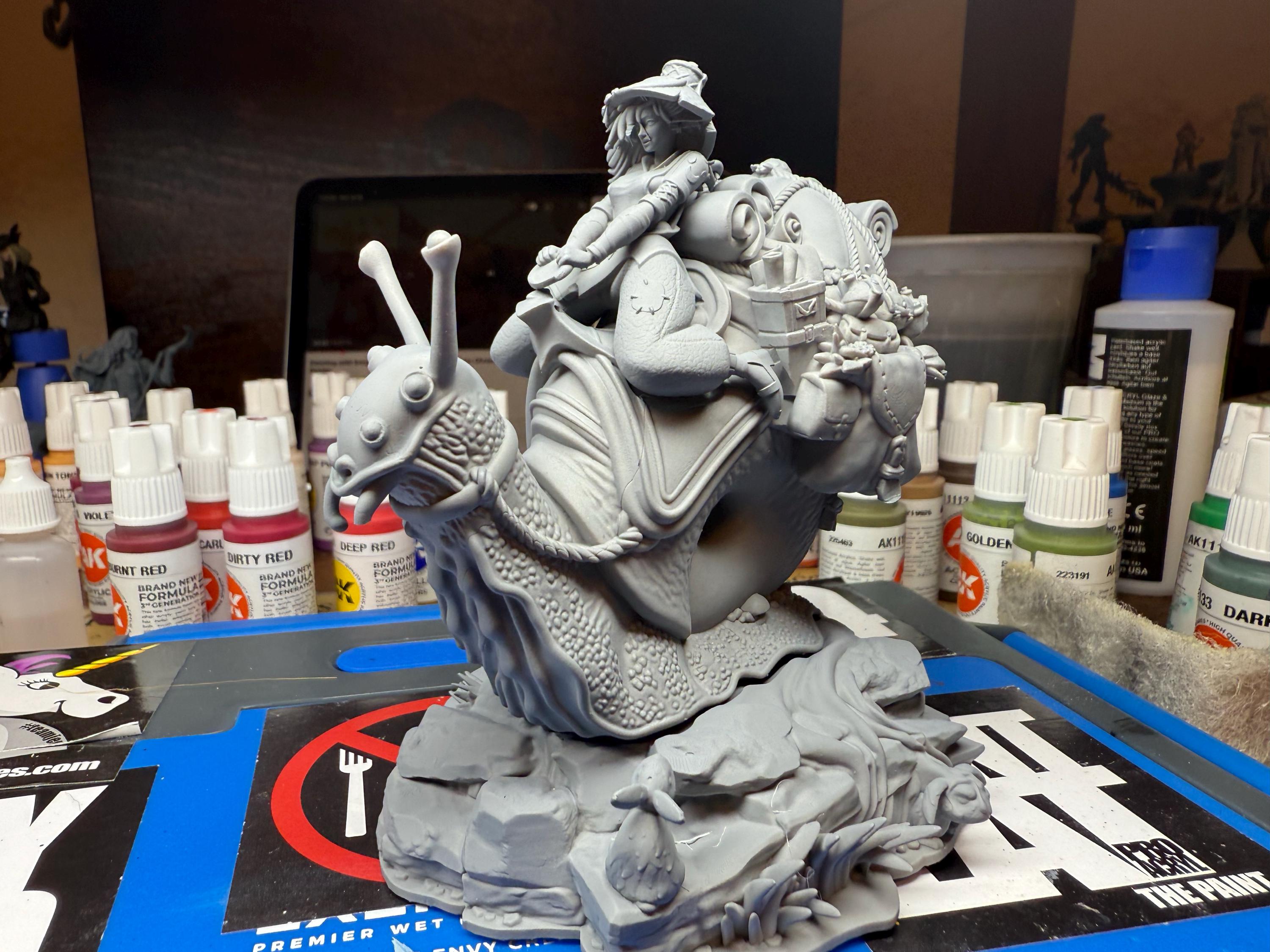 This miniature features a gorgeously sculpted snail mount, complete with coiling shell, expressive face, and detailed cargo. The female rider is both serene and seasoned, perfect for any game that needs a bit of slow-moving wonder or magical mystery. Whether she’s a Circle of the Land Druid, a wayfaring Monk, or a spell-hunting Lore Bard, her journey belongs to the stars—and to your story.
