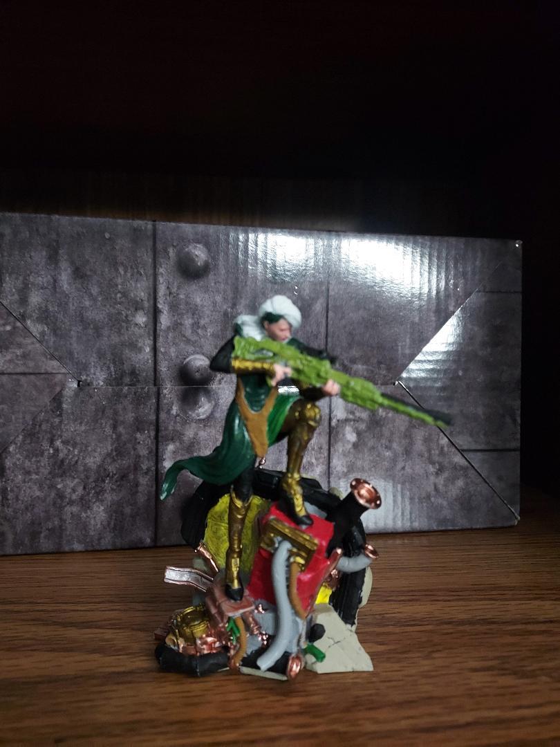 This hauntingly elegant sniper perches on a ruined industrial pipe, her rifle trained and her hair swept by phantom winds. Designed by Nerikson, this sci-fi miniature captures the tense stillness of a marksman in a post-apocalyptic world. Her body is half-human, half-machine—cloaked in plated armor and silent resolve. The long rifle she cradles is brimming with tech detail, and the base evokes the collapse of a lost civilization beneath her.