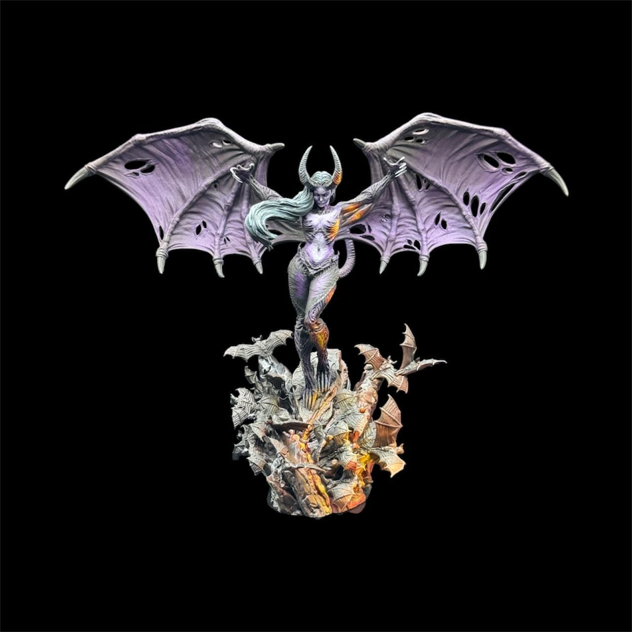 Her sculpted body fuses arcane power and demonic beauty. Elongated claws, ridged tail, and ribbed skin evoke something both alien and alluring, while the rock base rises like a throne from hell, studded with bat-like familiars. This is not merely a model—it’s a statement.