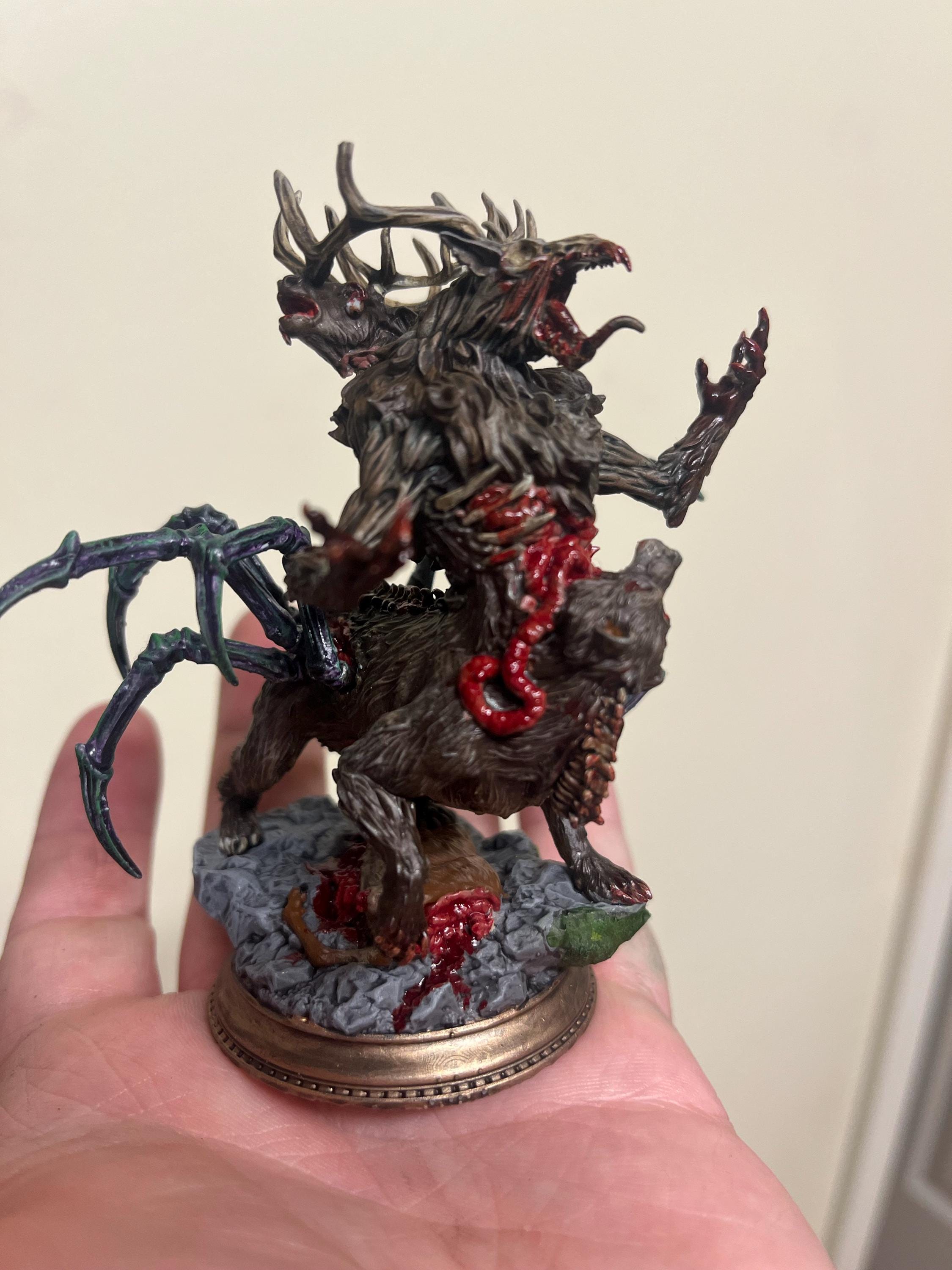 This miniature depicts a horrifying aberrant monstrosity—part stag, part beast, part spider, and all nightmare. With curling antlers, jagged claws, and arachnid limbs bursting from its back, the creature is a vision of corrupted nature.
